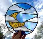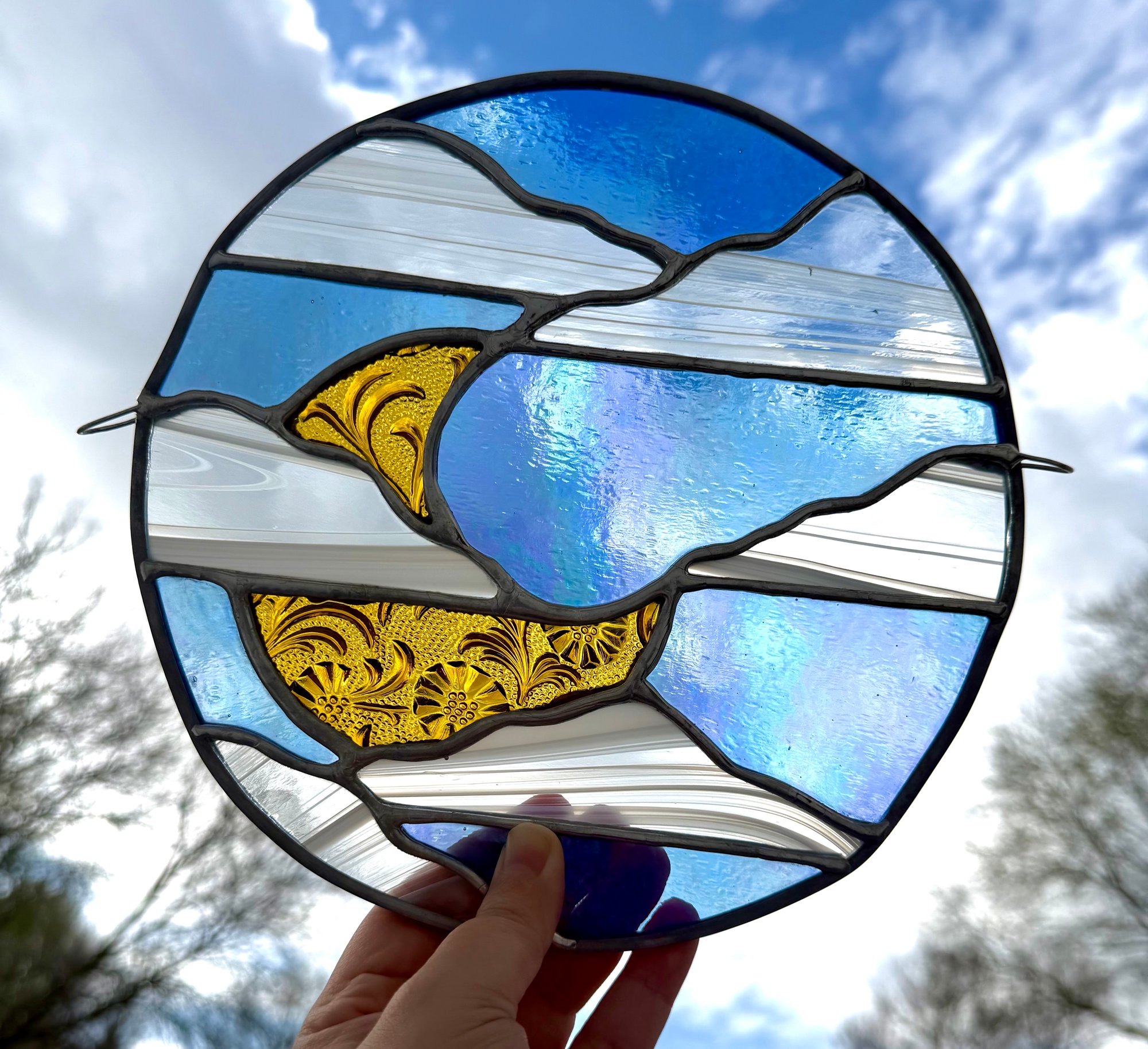 Periodic cleaning with a gentle glass polish and soft rag will help return your piece to its original shine! Do not use any harsh chemical or household cleaners on stained glass works, this can cause permanent damage to the piece.