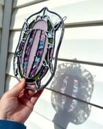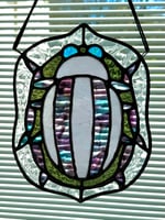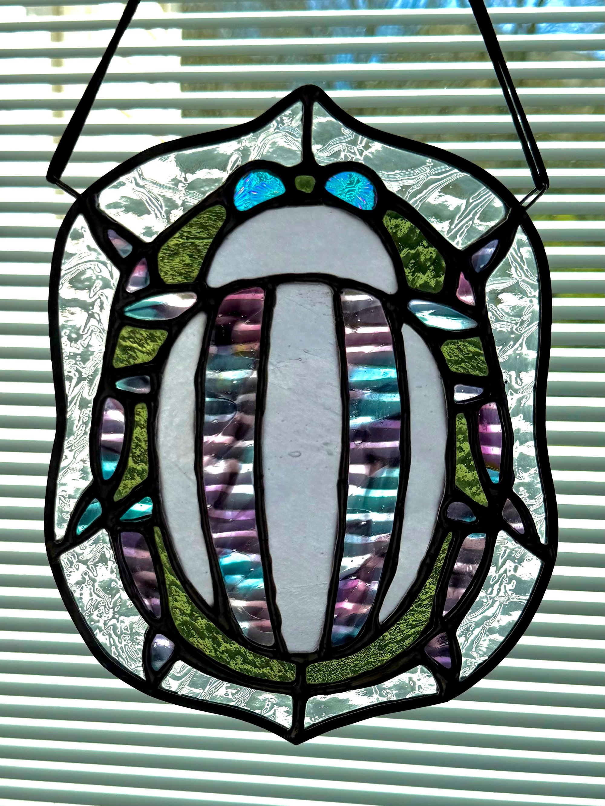 This handcrafted stained glass beetle is a study in light, texture, and transformation. The body is created from mouth-blown Fremont glass in shifting hues of pink, blue, and deep black, each segment catching the light like an iridescent shell hidden somewhere rare. The eyes are made from textured dichroic glass, shifting in color depending on the light; glowing bright blue when backlit, and revealing pink and yellow tones when lit from the front. It gives the piece a subtle, almost living quality, as if itโs quietly observing from within the glass. Surrounding it, rich olive green mouth-blown glass, with a crackle-style clear glass frame that adds movement and shimmer; like light passing through water or time itself.